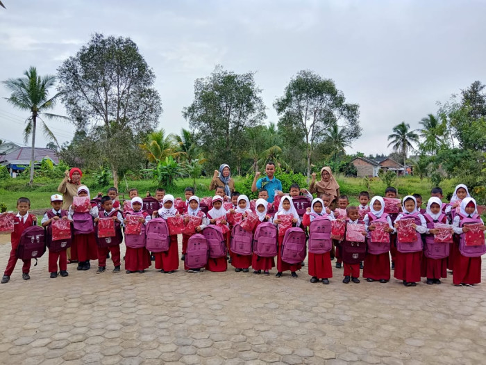 membagikan tas dan baju batik untuk murid kelas I SDN 23 Banyuasin 1. Alhamdullillah